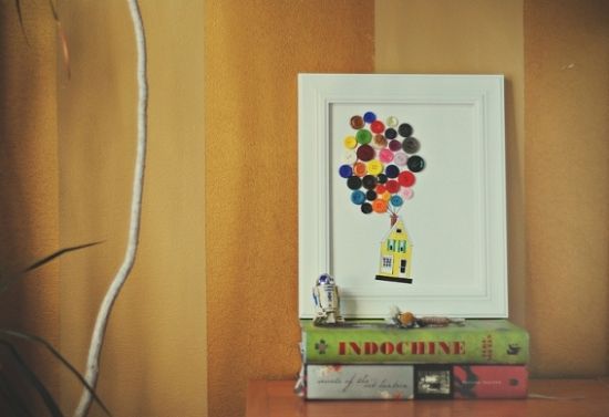 Logo após, comece a colar os botões aleatoriamente, como se fossem balões que estivessem erguendo a sua casinha.